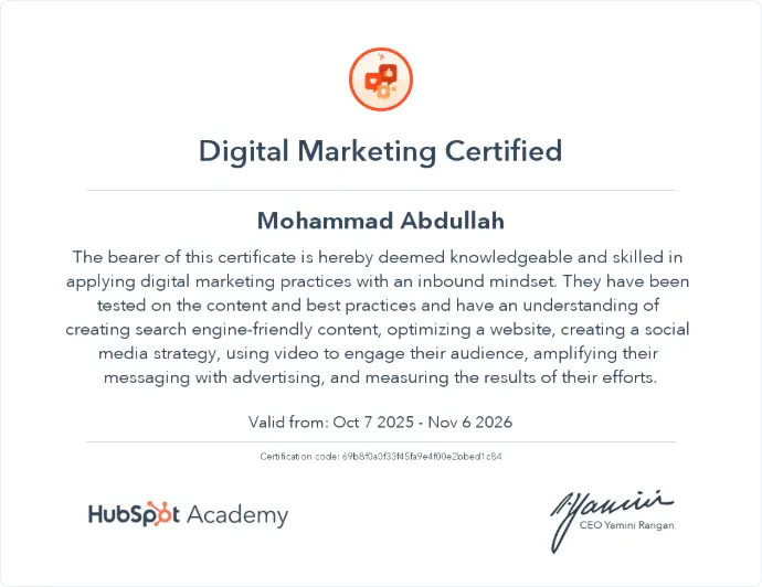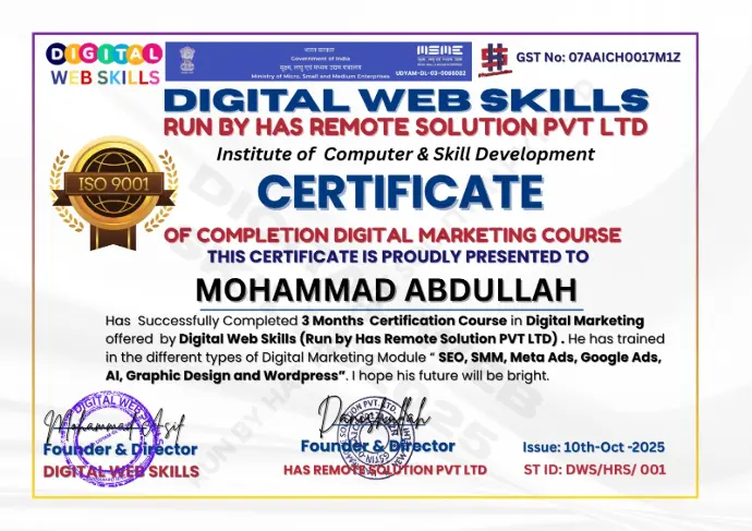 I am Mohammad Abdullah, an enthusiastic and dedicated digital marketing fresher who has successfully completed a professional digital marketing course from Digital Web Skills, conducted by HasRemote Solution Pvt. Ltd. Throughout the course, I acquired in-depth knowledge and practical experience in various aspects of digital marketing, including search engine optimization (SEO), social media marketing, content creation, email marketing, Google and Meta ads, and analytics. I also learned how to develop effective marketing strategies, optimize campaigns for better ROI, and use digital tools to analyze and improve performance. With a strong foundation and a keen interest in the ever-evolving digital landscape, I am eager to contribute my skills, creativity, and dedication to help businesses enhance their online presence, engage their audience, and achieve measurable growth. I am committed to continuous learning and staying updated with the latest trends and techniques in digital marketing to deliver impactful results.